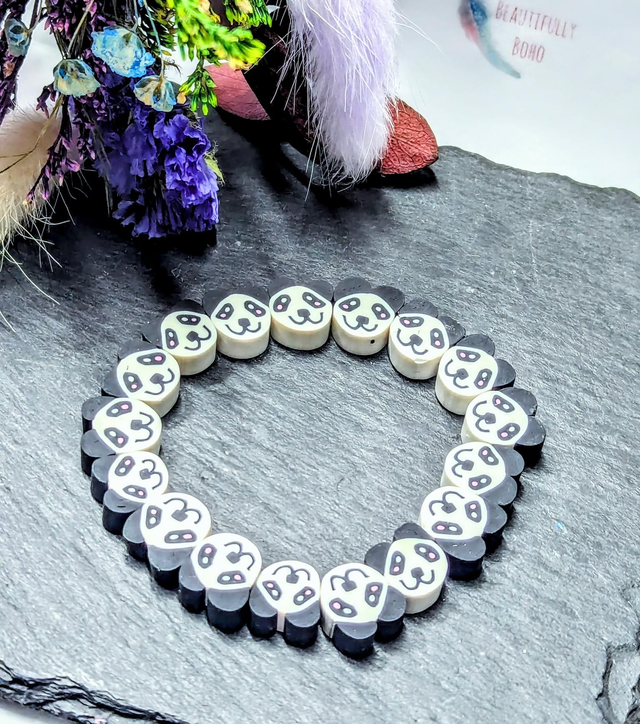 ▪️ Beautiful beaded stretch bracelet. Created with Black & White Polymer Clay Panda themed beads.